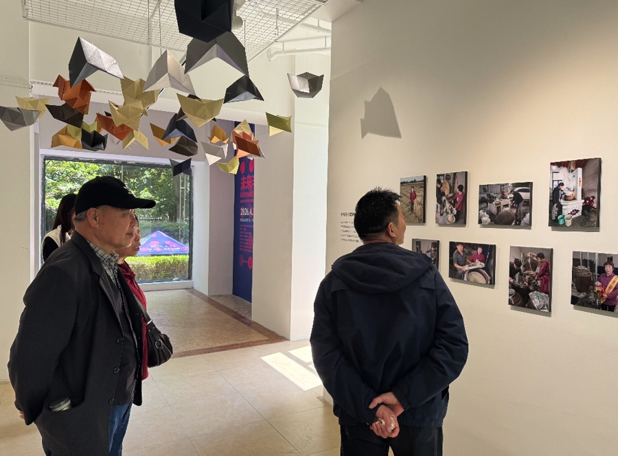 其中一个展览,是“海上・非遗”摄影展。由苏光禧、张龙、张俊、金大建、郭甫强、徐子良六位摄影师聚焦上海本土国家级、市级非遗项目,用镜头记录技艺瞬间、讲述传承故事。作品涵盖宝山鮰鱼烹饪技艺、崇明老白酒制作工艺、顾绣、南翔小笼、金山农民画、上海鲁庵印泥制作技艺,以情景再现手法突破传统纪实,还原非遗背后的人文温度与匠心坚守。